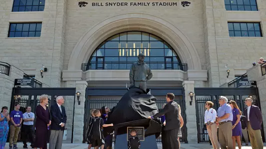 MANHATTAN, Kan. – The architect of the greatest turnaround in college football history will forever be enshrined at the stadium that bears his own name as K-State unveiled a statue of head coach Bill Snyder today as part of the West Stadium Center dedication celebration.