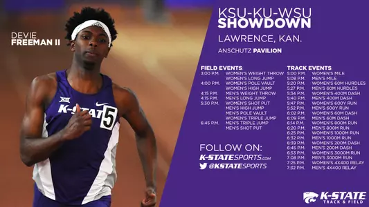 MANHATTAN, Kan. – After hosting its first three meets of the indoor season, the Kansas State track and field team will hit the road for the first time as it travels to Lawrence, Kansas, to compete in the KSU-KU-WSU Showdown on Friday.