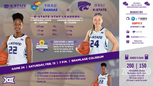 • 2015-16 All-America candidate Breanna Lewis leads K-State with career-best averages of 16.0 points, on a .553 field goal percentage, 7.0 rebounds and 2.5 blocks. She ranks fifth in the Big 12 in scoring, fifth in field goal percentage and ninth in rebounding. She ranks 26th in the nation in field goal percentage.