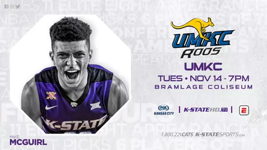 - Kansas State (1-0) continues its 6-game homestand to start the 2017-18 season, as the Wildcats play host to UMKC (1-1) at 7 p.m., on Tuesday at Bramlage Coliseum. K-State has won 17 of the 18 meetings in the series, including the 11 played at home (10-0 at Bramlage Coliseum). The matchup will mark the second time in four years that the two teams have squared off in the second game of the season with K-State coming from behind to post a 83-73 win over the Kangaroos on Nov. 17, 2014.