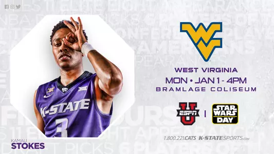 - Kansas State (11-2, 1-0 Big 12) returns home to Bramlage Coliseum to open the 2018 calendar year on Monday afternoon, as the Wildcats play host to No. 7/7 West Virginia (12-1, 1-0 Big 12) in the home Big 12 opener at 4 p.m. CT. The game will be broadcast nationally on?ESPNU with Mark Neely and Bryndon Manzer on the call. It will be just the second New Year's Day game in school history (and the first-ever at home) and the first since a 53-26 loss at Kentucky on Jan. 1, 1940.