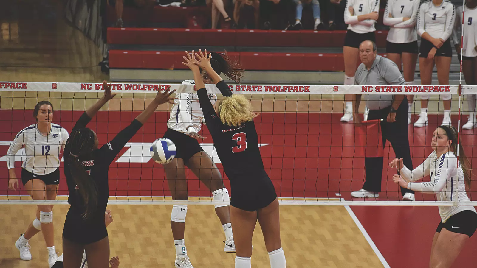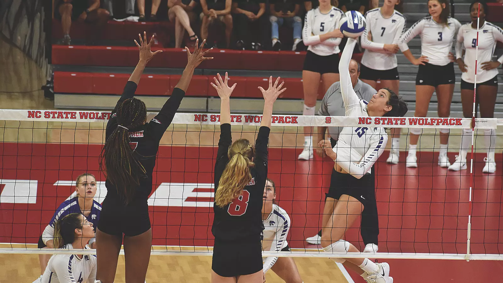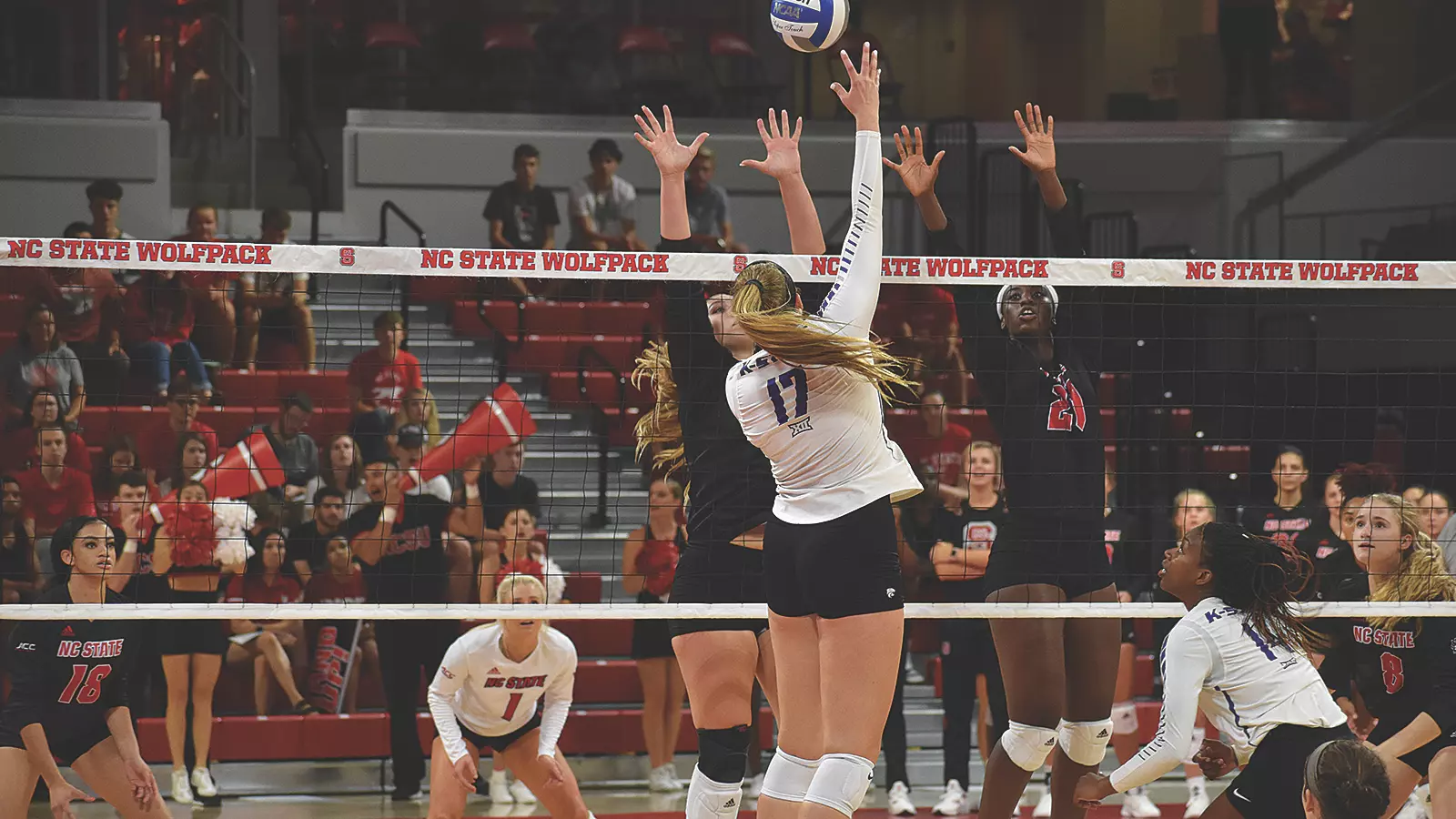 The Wolfpack countered with a 25-14 win in the second set, in which they hit .387 as a team (12 kills, 0 errors, 31 swings). K-State was limited to .098 hitting efficiency, as NC State picked up four team blocks in leveling the match. North Carolina State ended the frame by scoring eight of the final 10 points.