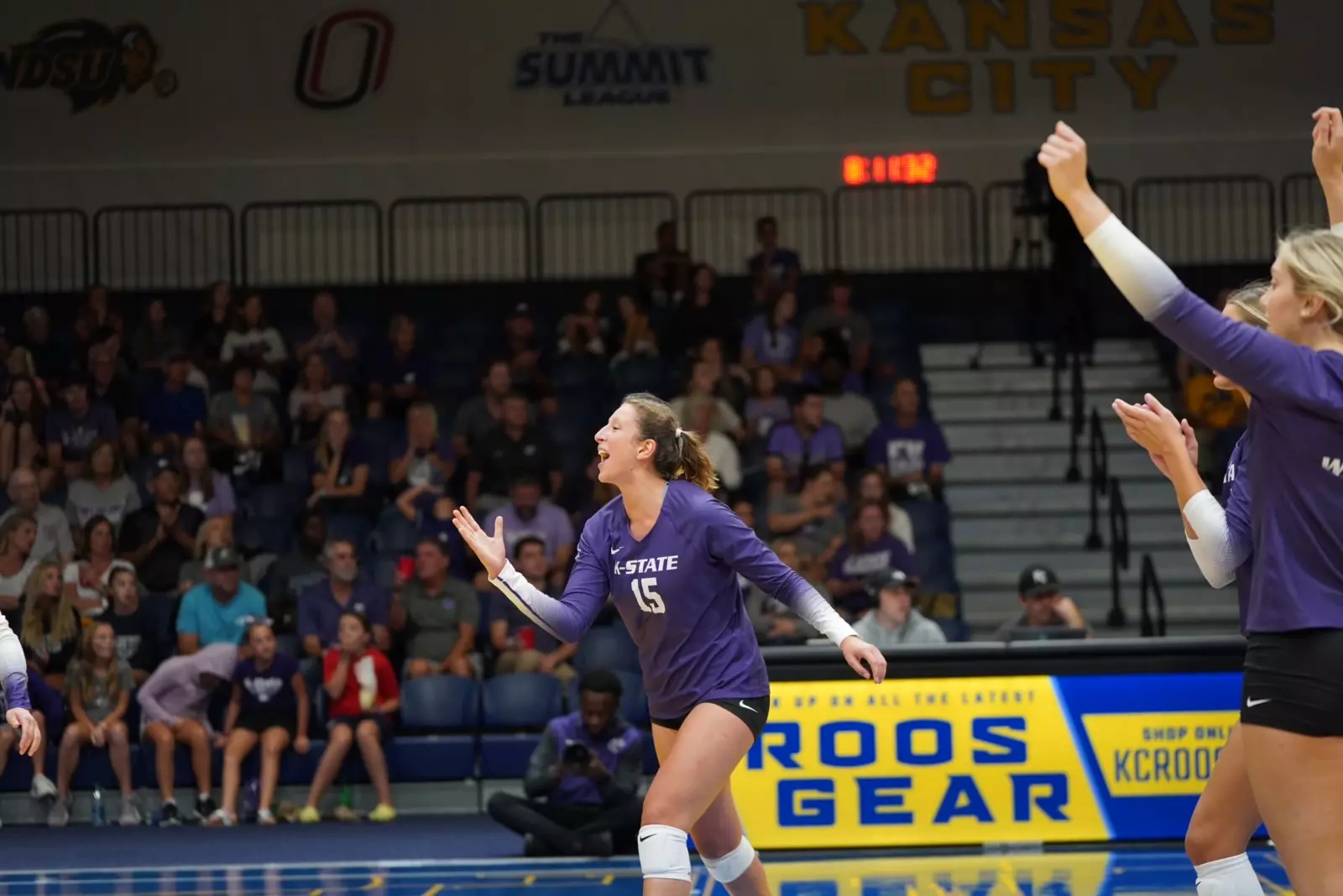 The night's final set held 10 tie scores and four lead changes, as the teams needed extra points to finish the third. K-State fended off three set-point opportunities from the Roos and later converted its fourth set-point attempt to seal the straight-set win.